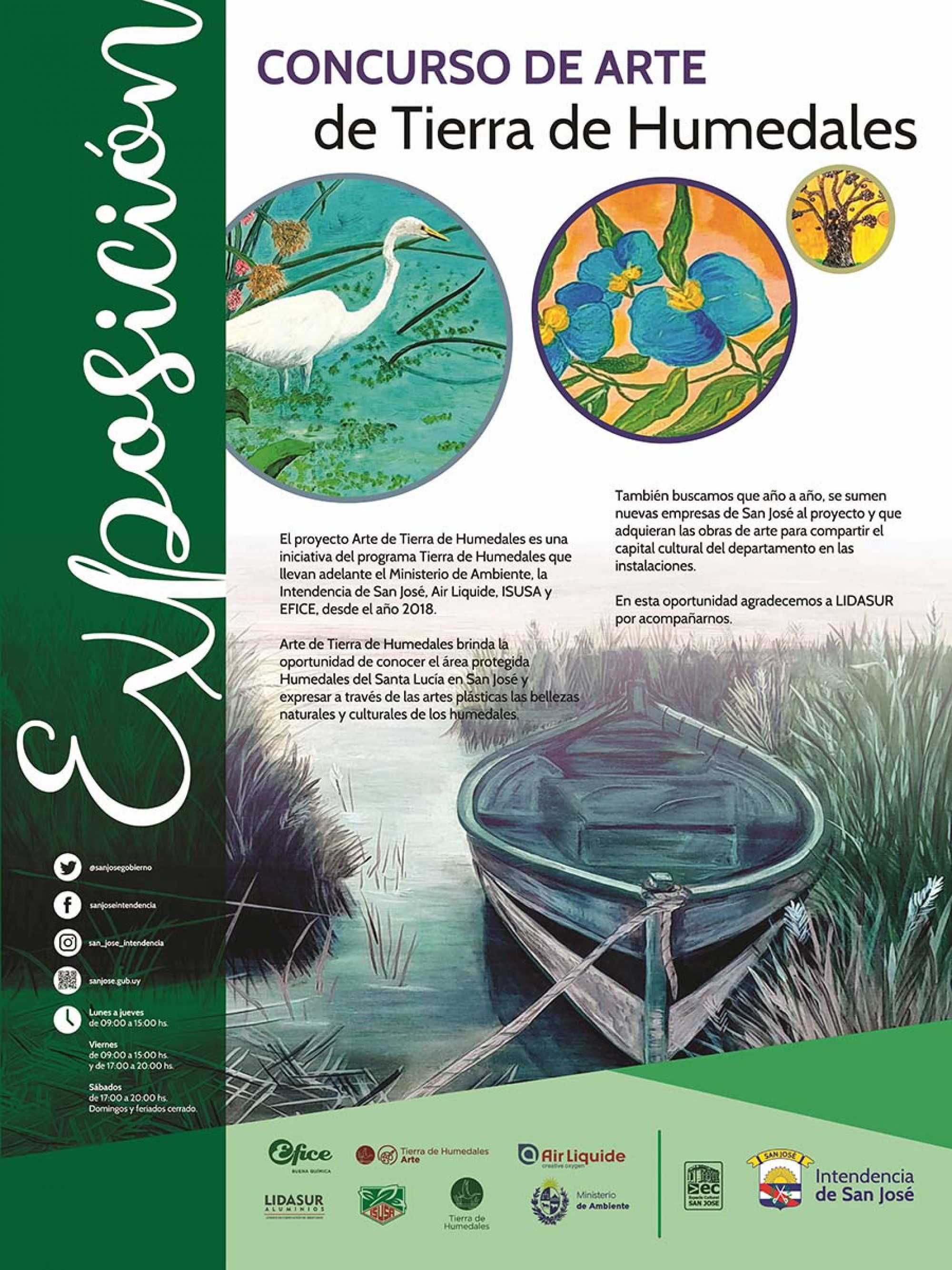 Durante el mes de julio, la muestra de obras plásticas del proyecto Arte de Tierra de Humedales se presentó en el Centro Cultural de San José. El proyecto está organizado por la Intendencia de San José, EFICE e ISUSA y cuenta con la colaboración de Air Liquide y LIDASUR. El objetivo de la muestra es presentar a los visitantes las bellezas naturales y culturales que existen en Tierra de Humedales y en el área protegida Humedales del Santa Lucía.
